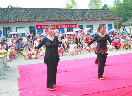 8月18日,花垣县石栏镇岩科村,村民们在表演节目欢庆金秋。当天,该村开展“激情飞扬庆金秋”活动,苗族群众载歌载舞庆丰收。今年,该村因地制宜引导农民发展万寿菊、养猪等产业致富,获得了丰收。 龙恩泽 摄