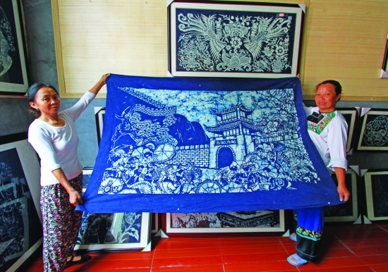 8月16日,花垣县双龙镇排碧村苗家蜡染技艺培训班上,苗族妇女在展示自己的蜡染作品。为了传承苗家蜡染技艺,蜡染传承人石杰忠开班免费培训学员,为返乡农民工、中小学生、蜡染爱好者提供学习平台。目前,蜡染产品供不应求。石杰忠成立了苗家蜡染合作社,当地留守老人、妇女利用农闲时间学习制作蜡染产品,每人每月可收入1500元左右。这样,蜡染技艺得到了有效传承,