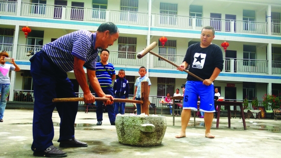 9月10日,花垣县长乐乡敬老院里,村民们在打糍粑。当天,该乡开展“爱在中秋节,情暖敬老院”活动。干部群众志愿者与敬老院的老人们一起开展打糍粑、做月饼、捉鱼比赛等活动,让他们感受到浓浓关爱之情。 龙恩泽 龙银慧 摄