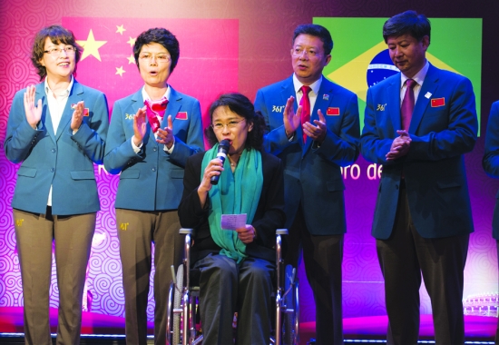 9月15日,担任里约残奥会中国体育代表团团长的中国残联主席、中国残奥委会主席张海迪(中)与代表团成员演唱歌曲《思乡曲》。 新华社记者 肖艺九 摄