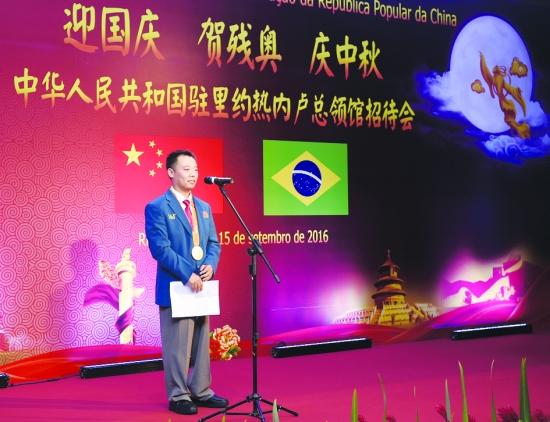 9月15日,在巴西里约热内卢,为中国代表团赢得里约残奥会首金的射击运动员董超在招待会上发言。 新华社记者 陈 铎 摄