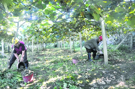 9月2日,永顺县松柏镇大桥村果农向明冈、符玉秀夫妇正忙着给猕猴桃追施牲畜肥料。向明冈家里种植猕猴桃6亩,一直采用农家肥培育,提高了果子质量,深受客户青睐,2万多斤猕猴桃近日销售一空。夫妻俩抓紧施肥壮树,以备来年丰收。 罗远程 摄