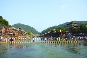 右图:中秋小长假期间,凤凰古城天气晴好,秋高气爽,景色怡人,吸引了众多游客前来游玩。图为9月16日下午,凤凰古城北门码头,游客正在穿过沱江上的跳岩。