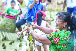 上图:9月17日,游客在花垣县双龙镇洞冲村体验捉稻田鱼的乐趣。抓住中秋小长假,花垣县20余个村结合自身的产业优势,或是让游客体验捕稻花鱼、或是游苗族特色村寨,吸引游客来县乡村旅游促农增收。