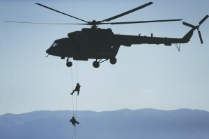 9月18日,在吉尔吉斯斯坦巴雷克奇举行的“和平使命—2016”上海合作组织联合反恐军事演习第二次实兵实弹合练中,俄罗斯特战队员从运输直升机上机降至“敌”后方。