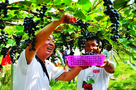 下图: 9月16日,凤凰县新场镇大坡村葡萄园里游客喜摘葡萄。近年来,该村在县委、政府产业精准脱贫工程引导下,栽种1028亩野生高山葡萄,金秋熟季迎丰收。当天该村举办第二届葡萄采摘节,千亩生态葡萄园开园,喜迎八方游客免费采摘。 滕建康 摄