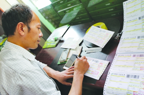 徐嘉志一边翻看手机记录,一边认真填写快递单