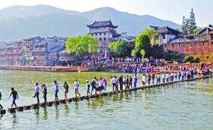 国庆长假期间,凤凰古城天朗气清,金风送爽,秋景宜人,吸引了大批游客前来游玩,各个景点人头攒动,场面火爆。图为10月3日的古城景象,仅当天全县即接待游客8万余人次。 滕建康 摄