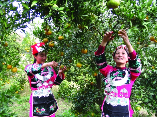 椪柑丰收果满枝,苗家阿妹笑开颜。