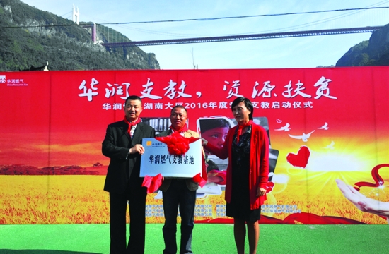 10月18日,“华润支教、资源扶贫”启动仪式在吉首市矮寨小学举行。华润燃气集团湖南大区11家成员公司负责人及代表参加启动仪式,为100余名贫困学生捐赠助学金共计85000元,为矮寨镇吉龙村小捐赠2万元校园建设基金和价值近3万元的课桌椅、书柜、乒乓球桌、微波炉、饮水机、校服、文具等爱心物资。华润燃气湖南大区执行总经理费阔与吉首市教育局负责人共同授牌矮寨小学成