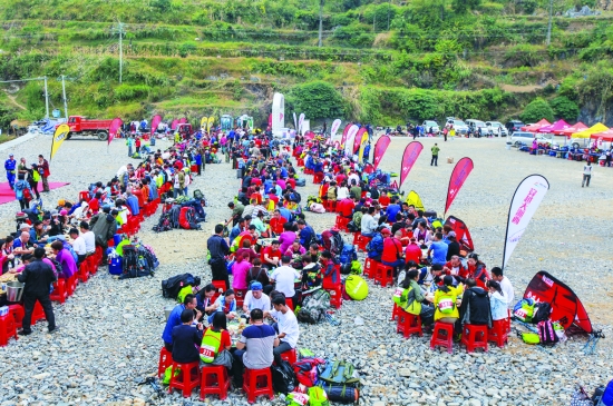 10月16日,花垣县十八洞村村民摆着长桌宴,款待徒步到此观光和体验苗族风情的500余名省内外驴友。近两年,该村以民俗文化和自然生态为依托,积极探索乡村旅游脱贫新路,今年1月至10月上旬接待游客近30万人次。 特约记者 龙艾青 摄