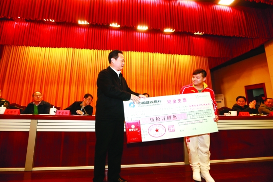 州委书记叶红专(左)为第31届夏季奥运会男子举重56公斤级冠军龙清泉(右)颁发杰出贡献个人奖励。 本报记者 彭 伟 摄