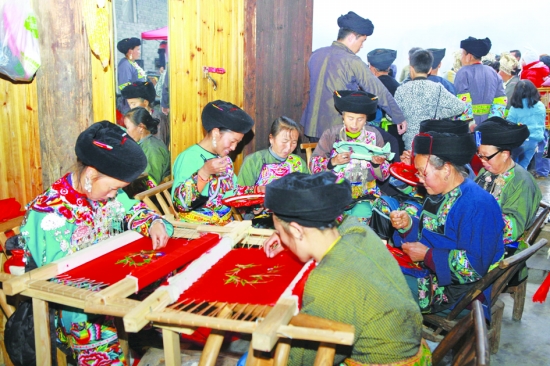 十八洞村的“俏绣娘”正在集体绣苗绣。 龙艾青 摄
