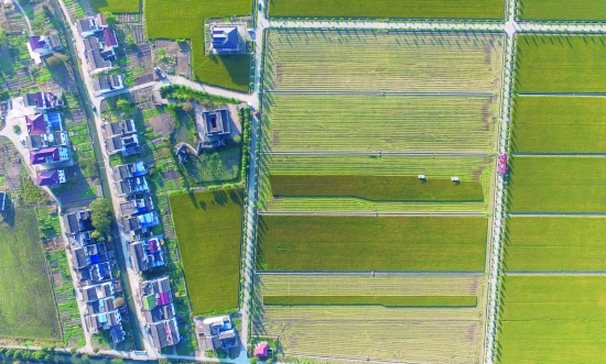 航拍松江家庭农场稻田秋收美景(11月6日摄)。 近日,上海松江区家庭农场呈现一派丰收的景象。截至目前,松江区家庭农场粮食种植面积占全区粮食种植面积的95%,户均经营面积143.3亩。家庭农场是指以家庭成员为主要劳动力,从事农业规模化、集约化、商品化生产经营,并以农业收入为家庭主要收入来源的新型农业经营主体。 新华社记者 裴 鑫 摄