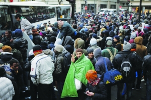 11月4日,在法国巴黎斯大林格勒地铁站附近,难民准备乘大巴离开。
