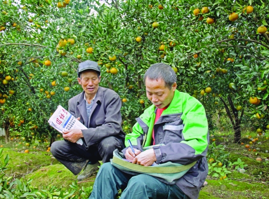 11月19日,保靖县清水坪邮政局邮递员田洪文正在橘园给村民办理党报党刊征订事宜。自2017年党报党刊征订工作开展以来,该邮局组织邮递员深入田间地头,上门入户征订,既方便了群众,又提高了工作时效,受到村民的好评。 俞采华 陈亚平 摄