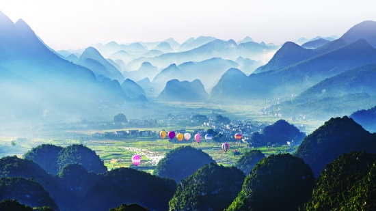 2015年与2016年,兴义市成功举办首届国际山地旅游大会与2016国际山地旅游暨户外运动大会,兴义市的山地旅游在国际上崭露头角,使该市在国际、国内旅游界的知名度日渐提升,图为兴义万峰林景区的热气球竞技。 蒋 挺 摄