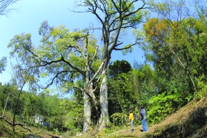 11月27日在龙山县桂塘镇前丰村拍摄的“夫妻树”。 两株黄连木连理古树生长在该村一块巨大岩石上,树下岩板有溶洞相通。树根连着溶洞中两条并生的钟乳石,当地人称它为“岩连树”。根基连生,一苑双干。雄株高26米,胸径164厘米。雌株高24米,胸径145厘米。雄株主干高4.5米处生有径粗60厘米的大桠,与雌株主干高5.5米处一径粗50厘米的大桠扭抱连理愈合。连理后雄株大桠盘抱雌株主干后,又曲转回雄株,与干高13米处另一大桠又连理生长。两树根干相连,树冠交错,组成一个冠幅750平方米的伞状树冠,恰似一对亲密无间的夫妻,故称“夫妻树”。 曾祥辉 摄 |