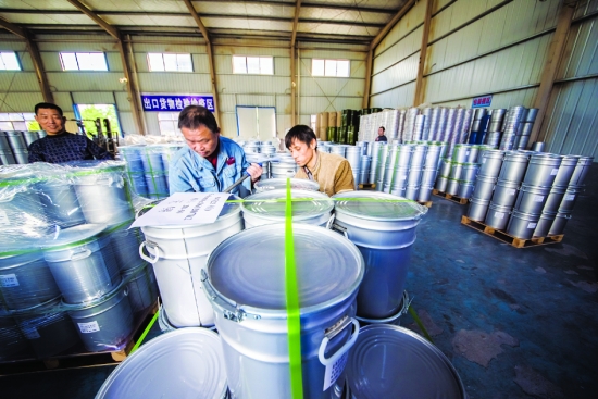 12月8日,泸溪金昊铝业有限公司员工正在仓库打包成堆的产品,准备销往外地。该公司创办于2011年8月,是一家专业从事特细球形光伏铝粉、铝基合金复合粉体材料、新型铝热焊接材料等高性能金属新材料产品生产、研发的高新技术企业,是湖南省经信委认定的第一批新材料企业之一。公司拥有自主研发专利技术10项,有年产5000吨铝基合金复合粉体材料、年产10000吨特细铝粉生产线