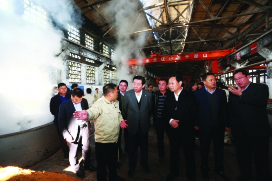 中粮集团党组书记、董事长赵双连(前排右四)一行在州委书记叶红专(前排右三)等州领导陪同下来到酒鬼酒公司,调研企业生产经营发展情况。 本报记者 彭 伟 摄