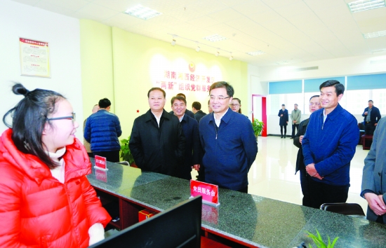 省委常委、省委组织部部长王少峰(前排右二)一行在州委书记叶红专(前排右三)等州领导陪同下来到湘西经开区党群服务中心,调研基层党建工作。 本报记者 彭 伟 摄