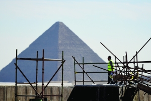 1月3日,在埃及首都开罗,一名工人从大埃及博物馆施工工地走过。