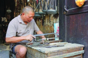 文/图 杨涛 从浦市古老的青石板路走过,我们突然发现一家破旧的民居里,一个中年男子坐在堂屋的左侧,正在制作杆秤。随着电子秤的普及,杆秤的使用频率也越来越低,上街去买菜或水果,已少有卖家用杆秤给我们称东西,取而代之的几乎都是电子秤了,在浦市居然还有人在做杆秤,这不得不令人称奇。强烈的好奇心使得我停了下来,拿着相机东拍西拍,做杆秤的师傅也并不恼火,甚至习以为常,看也不看我一眼,依然故我地做他的杆秤。我不好意思地说,师傅,拍个照没意见吧?他微微笑了笑说,你拍吧。 我不知道这个做杆秤的师傅还能坚持多久,很多人现在连杆秤都不会认,做生意的人图方便也懒得再用杆秤,这个师傅如果单凭卖杆秤恐怕已经不能维持生计。幸好他的房子临街,所以他就把堂屋空了出来,放两根条凳,凳子上铺上门板,再摆了点本子、手帕之类的杂货,一个杂货铺,亦是杆秤铺。杆秤师傅就一边做杆秤一边做杂货买卖,才得以养家糊口。当我们问及做好一把杆秤需要那些工序时,杆秤师傅头头是道地给我们讲述起来,从选材、刨圆、浸泡、打磨到钉秤花、装秤盘,师傅说得很详尽,而我们终因为隔行如隔山,听得一头雾水,只知道制作一把小小的杆秤也需要很多工序,花很多时间。 看着做杆秤的师傅认真执着的表情,我开玩笑说:“那个秤花你随便打打就好了,要那么精确做什么啊?现在的人买东西又有几个会看秤?有的奸商为了克扣斤两都要故意把秤弄得不标准,你还这么认真做什么?”没想到做杆秤的师傅立马变了脸,说:“我做秤从来不会短斤少两,做生意的要怎么称秤,那是他们的事,我做秤必须讲良心,无论偏轻偏重都是缺德,会有报应的。”杆秤师傅的话朴素正直,让我肃然起敬,不由为自己的随性而自责,即便是坐在路边毫不打眼的杆秤师傅也有其职业道德准则,我要做的应该是尊重而不是调侃。 我又问:“现在买杆秤的人不多了吧?”杆秤师傅回答:“确实不多,也没个准数,有时候一天会卖掉一把,也有时候一个月才能卖掉一把。”一个月才卖一把杆秤,这是什么概念?我瞠目结舌地说道:“买杆秤的人那么少,你能赚钱吗?还做这个干什么啊?”“我原来也不做了的,可是又有好多人找我买秤,要求我做,我才重新拾起了这门手艺。毕竟是老祖宗传下来的,做就做呗,也别让这手艺在我这儿失传了。”杆秤师傅很平淡,一副荣辱不惊的样子,想来,如此的时光早已是习以为常了。 |
