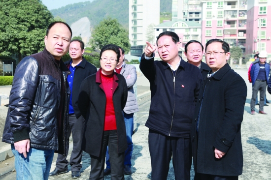 州委书记叶红专(前排右二)、州委副书记、州长龙晓华(前排左二)在州委常委、吉首市委书记刘珍瑜(前排右一)陪同下调研永吉高速的建设情况。