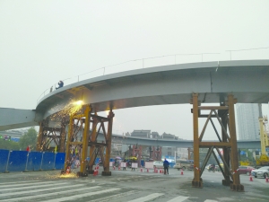 该桥属该市新建的人行天桥二期项目之一,为环形人行天桥。该桥建设数据显示,圆环中心线半径为23米,环形桥梁总长约144.51米,宽4.62米。上部为全焊钢结构,主桥桥墩采用矩形钢管混凝土柱,桥梁基础采用钻孔灌注桩。图为焊接施工场景。