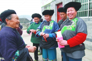 1月18日,花垣县双龙镇卧龙坪村,贫困户高兴地领到了红包。当天,该县教体局开展“送温暖”活动,为该镇卧龙坪村和让乍村,共94户贫困户发放了红包、棉被和冬衣,让困难群众温暖过大年。近两年来,在该局精准帮扶下,这两个村已有79户农家摘掉了贫困户“帽子”。 龙恩泽 摄