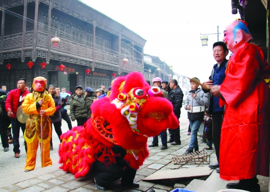 正月初二,龙山县里耶古城舞狮队走上街头,为群众拜新年。 俞采华 胡荣春 摄
