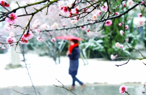 2月8日,游客漫步在初降春雪的江苏省淮安市洪泽湖古堰景区。