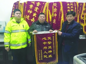 2月11日,吉首市民贺启平来到市交警大队,为大队事故处理中心副中队长谢华警官送上一面锦旗,锦旗上写着“交警显神威,心中为人民”几个镀金大字。 2月2日,贺启平的岳父贺水健驾着一辆电动车在州烟草公司科技园北路行驶,被一辆从旁边突然驶过的摩托车撞翻在地,老人头部受伤,血流不止,肇事司机却当场逃逸。2月6日,市交警大队事故处理中心在受理该事故后,副中队长谢华不顾春节休假,带领队员们主动出击,在肇事摩托车无牌照等不利因素下,克服重重困难,24小时内成功破案。目前,肇事司机向某被抓获,事故也得到了依法处理。图为市民贺启平(右)为谢华(中)送上锦旗。 刘琪洲 欧阳文章 摄 |
