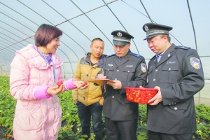 春节期间,泸溪县严把农产品质量安全关。连日来,农业执法人员先后在达岚、武溪、浦市、白沙等乡镇对产地、农贸市场和超市的瓜果蔬菜质量进行严格的检查,为百姓食用的农产品质量安全保驾护航。图为执法人员在浦市马王溪农业生态园抽检草莓样品。
