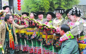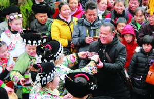 文/图 通讯员 张耀成 龙腾狮跃,鼓响锣鸣。2月6日,花垣县双龙镇举办苗族接龙节活动,以盛大的民族文化活动喜迎元宵节的到来。 接龙节是苗族人民传统的祭祀节日,活动以祈求五谷丰收、六畜兴旺、氏族昌盛为目的,活动分家庭接龙、村寨接龙两种形式,均包括祭龙、接龙、安龙等环节。 接龙是苗族人民自然崇拜、图腾崇拜、祖先崇拜的综合体现,是苗族独特文化的展示,一般在节庆期、家庭或村寨重大喜庆的日子里举行。 双龙镇鼓戎湖村开阔的田野是活动举办的地点。但见人流如织、彩旗飘飞,一位老者带领千余村民,盛装走在蜿蜒的田埂上。姑娘打彩伞、苗汉舞钢叉、苗师举旗幔,流动的队伍浩浩荡荡,在田野上形成几百米长的游龙。一位苗族姑娘介绍,队伍要到东方的水井处,进行接龙前的“取水”活动。 取水完毕,接龙的队伍来到寨门。祭师口念祭词,手端祭品,三拜九叩,行完祭礼、进入寨门。队伍与等在门前的三条巨龙开始汇合。一时间,巨龙翻滚、雄狮腾跃,耍棍的、玩刀的、舞叉的相继涌入,人流向村中涌去。 “金鸡报晓千声脆,青龙翻腾万象欣。”用松枝扎成的寨门,镶嵌着一幅大大的对联。联中的毛笔大字,分别用红纸贴着,镶嵌在20个直径1米的圆形竹筛之中。对联的横批“鼓戎湖接龙节”特别引人注目。 楼门下,一群穿金戴银的苗家姑娘,用一条8米多长的红绸拦住了一拨拨观光的客人。几位年轻的姑娘将8碗包谷烧端到客人面前,然后用苗歌、趣语、敬言,“逼”着他们喝拦门酒。一位小伙清清嗓子,硬着头皮接过一碗酒,闭眼喝下,兴头上,唱出一首现编的苗歌———“金银满身花满怀,苗家姑娘好可爱。来此一心结良缘,罚我千杯也愿挨。” 村中,民族文化展演场地围满了来自四面八方的村民和游客。节目展演报名处,各村文艺队排队报名,接龙舞、鼓舞、竹竿舞……走进一看,节目单上已记录有50多个。 “这么多,今天演得完吗?”在笔者疑问声中,负责主持的村民介绍:“节目超过预计的数量,我们只有采取补报和分场地展演的办法来解决。” 接龙舞是接龙节必须表演的舞蹈。30多位苗族姑娘手持红伞,在表演场中频频变换队形和姿势,把30多把红伞舞成气贯长虹、游龙翻身等美丽图案。周围3条巨龙围成圆圈,边游边舞。场地中数千人一边观看、一边喝彩。踮了脚尖也看不到的人们,纷纷走向民房的楼顶和附近山腰,借着有利地形观看精彩的节目。人群中的快门、天空中的航拍,把苗寨的每一处精彩全数收录。 在村中石头巷子里,10多位苗族姑娘把10多个挖通竹节、削成斜口的竹筒连在一起,由高到低曲形排列。站在高处的姑娘怀抱一坛美酒,严阵以待,随时准备把酒输入竹筒,让美酒淙淙流进客人的嘴里。午餐后,几位男客被这支队伍堵在了小巷。站在最低处的姑娘,用玉指轻启一位壮汉的嘴唇,请他张开了仍留酒香的嘴巴。 “喜欢风景喝一杯,喜欢苗寨喝一杯,喜欢姑娘喝一杯。喝一杯,喝一杯,喝来满田丰收惠;喝一杯,喝一杯,喝得月圆花儿美;喝一杯,喝一杯,喝得姑娘我心醉。”姑娘们唱起劝酒歌,连续“轰炸”,一泓美酒“高山流水”般地由竹筒流出,流进了汉子们的嘴里、心里,看着他们或惬意或难堪,姑娘们开怀大笑、掌声四起。 打糍粑的咚咚声、织苗绣的唧唧声、长桌宴的碰杯声和姑娘们的欢笑声,在苗寨里谱成了一首美丽的交响曲。 |