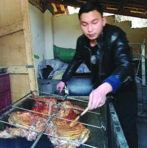 2月5日大年初九,在大山深处的泸溪县浦市镇都岐村白牛洞烤全羊农庄,厨师正在为新春第一批客人烤制全羊。随着浦市古镇旅游兴起,借力古镇旅游和本地优势生态,该村村民紧扣本地特色山羊养殖产业,突出“土、特、纯”将烤全羊做为农家乐主打特色品牌,发展乡村游,拓宽山羊销路。 唐正海 摄