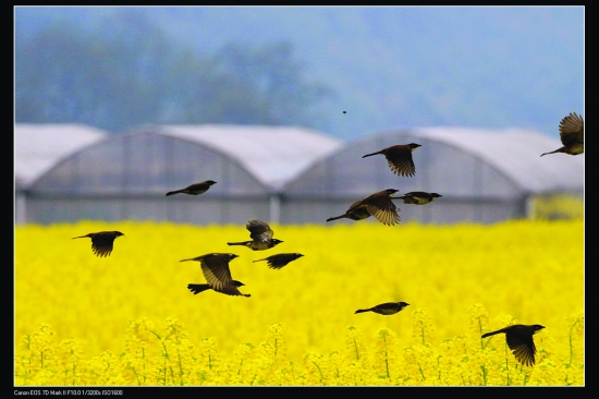 靛房镇,成群的鸟儿在油菜花里嬉闹飞行。