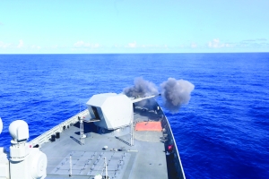 2月19日,在海上现场反击演练中,长沙舰对“敌舰”进行主炮火力射击。