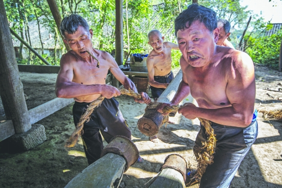 曾经油坊的劳作场面。 打油时,油匠摇动油锤,齐喊号子,场面壮观。 向明海 摄