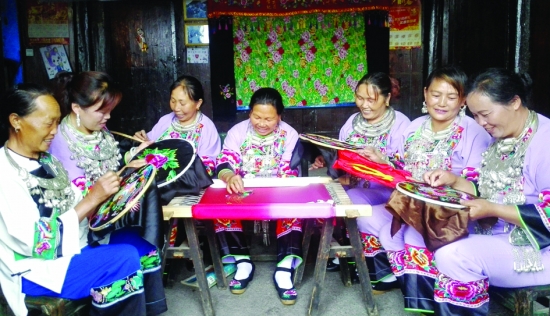 ▲ 十八洞村妇女在老支书石顺莲家中绣苗绣。