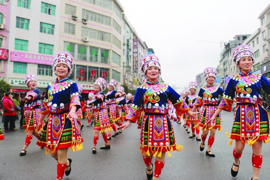 3月6日,龙山县800余名妇女身着盛装,在主要街区游行表演土家摆手舞,以庆祝“三八”国际妇女节的到来。 宋国胜 摄