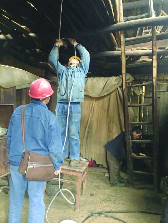 3月20日, 国网凤凰县供电公司员工为廖家桥镇南泥村贫困村民杨政权家免费安装用电设备。据悉,杨政权家因为极度贫困而一直没有用上电,供电公司得知消息后马上前往为其安装用电设备,结束了杨政权家无电的历史。 本报记者 周 堃 通讯员 朱其华 摄 电力服务扶贫帮困