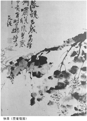 纯以水墨写葡萄,以饱含水分的泼墨写意法,点画葡萄枝叶,水墨酣畅。一根老藤错落低垂,数串葡萄倒挂枝头,晶莹欲滴,茂叶以大块水墨信笔挥洒,任乎性情,意趣横生,风格疏放,作画状物不拘形似,以放纵简逸的寥寥数笔,就浑然天成地传达出物象的神韵。用笔似草书飞动,淋漓恣纵,极其桀骜不驯,有一气呵成之感,诗画与书法在图中得到恰如其分的结合,代表了徐渭大写意花卉的风格,也是明代写意花卉高水平的杰作。