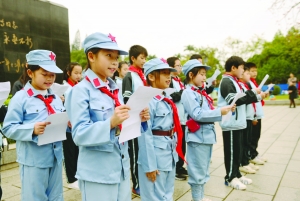 3月29日,少先队员在南宁市南湖公园烈士碑园进行诗朗诵。