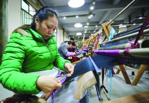 3月29日,工人在湖南张家界武陵源区乖幺妹土家织锦基地织锦。