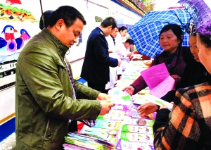 3月30日,泸溪县卫计局组织工作人员走进洗溪镇芭蕉坪村,通过设置防艾、无偿献血、保健知识、优生优育宣传展板咨询台,发放宣传资料,免费体检、开展卫生计生健康指导及“三高预防”、“倡导合理生活方式”专题讲座等形式,将健康送到了苗乡群众身边。图为该局工作人员正在为群众发放健康教育知识读本,宣传卫生保健知识。