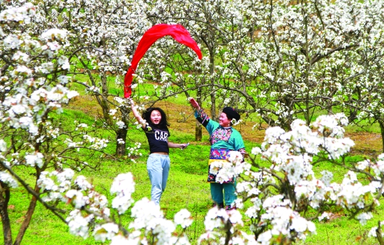 4月2日,花垣县下寨河千亩梨园花开正艳,人们正忙着拍照赏花。 龙恩泽 摄