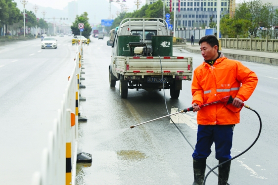 3月20日,湘西经开区环卫工人正在清洗交通隔离护栏。为积极营造干净整洁的城市卫生环境,连日来,该区积极组织辖区环卫工人、志愿者来到辖区卫生死角地带,为城市和社区“梳妆打扮”,助推美丽园区建设。 本报特约记者 刘振军 通讯员 张术杰 颜 姗 摄