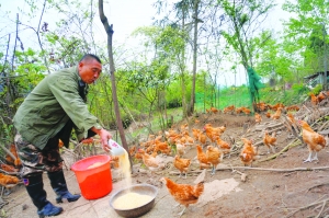 4月11日傍晚,永顺县灵溪镇树木村,45岁的村民李传胜正手提食料、吹着口哨,招集放养山林里的土鸡回家进食。今年,该县启动科技惠农脱贫工程,建立产业发展与村民利益紧密结合的可持续增收脱贫机制,发展特色养殖业,让村民精准脱贫。曾经在甘肃省打过7年工的李传胜抓住“鸡”遇,见“鸡”行事,返乡创业。他利用山、林、水、草得天独厚的自然环境,上山安营扎寨,生态放养土鸡。如今,他放养在山林中的2500只土鸡,长势良好,增收在望。