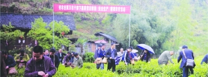 右图:4月9日到10日,州直林业系统的78名干部职工来到驻村扶贫联系村———保靖县葫芦镇枫香村开展集体结对帮扶活动。在为期两天的活动中,该系统干部职工看望慰问了结对帮扶户并与他们共同商议制订脱贫措施,并与该村留守儿童开展一对一帮扶。图为该系统干部职工帮助村民一起采摘黄金茶。 郭 霖 摄